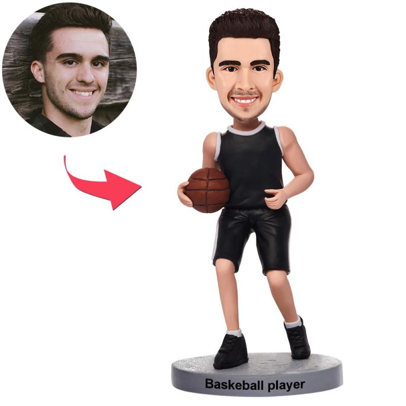 Home / Basketball Player Dribbling In Black Uniform Custom Bobbleheads With Engraved Text