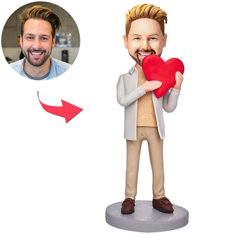 Casual Wear Man Holding A Love Heart Custom Bobbleheads With Engraved Text