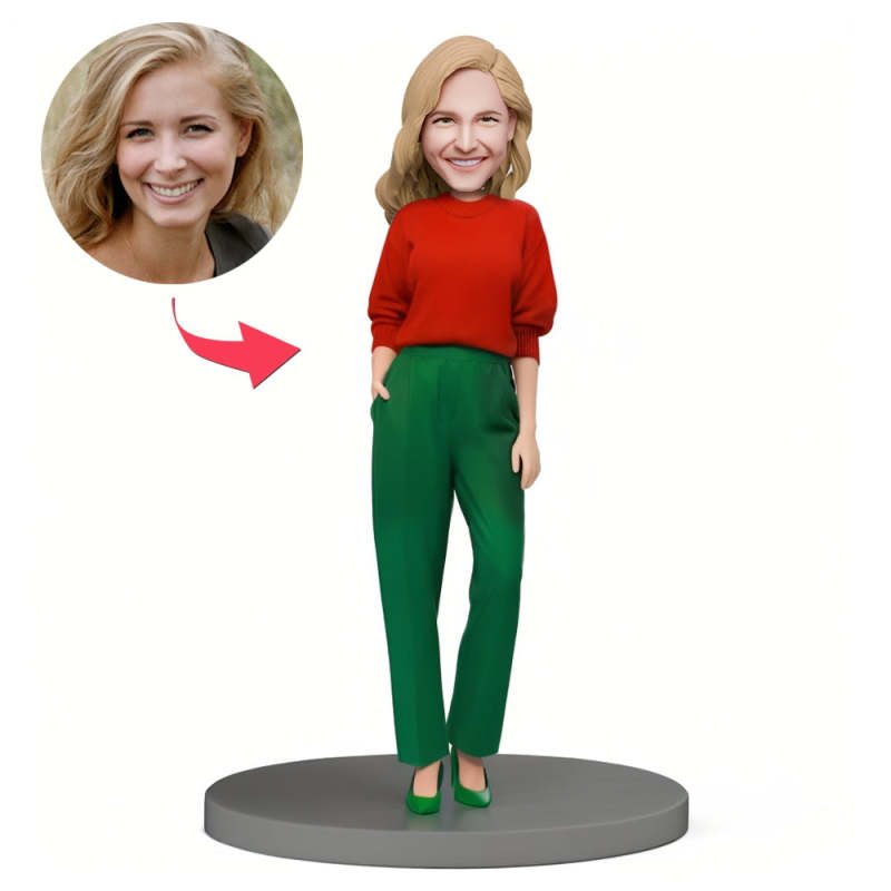 Christmas Gift Custom Bobble Head Woman Wearing Red and Green Christmas Fashion Suit