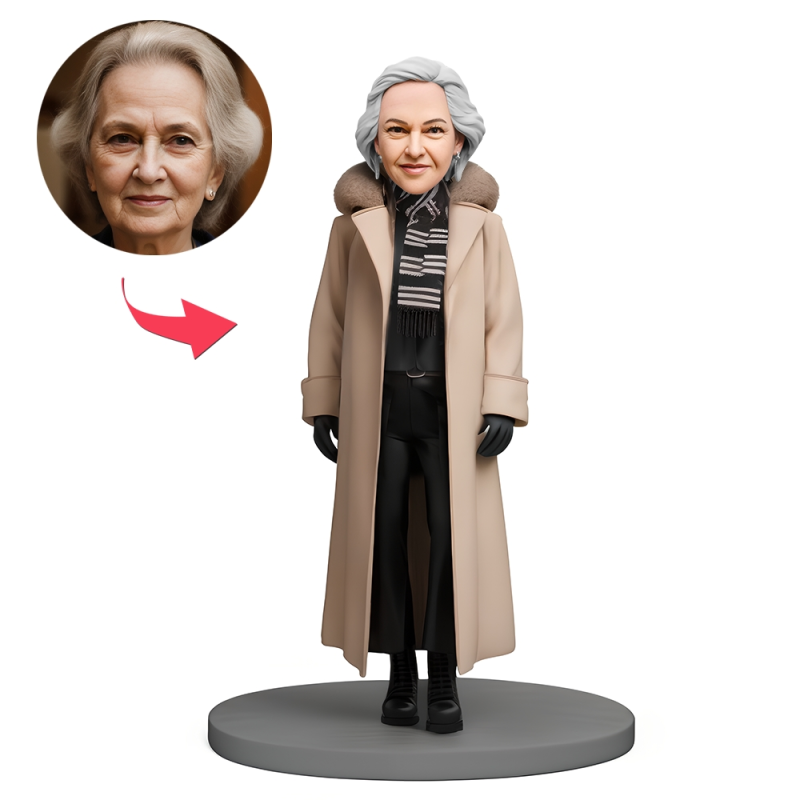Custom Bobblehead Elderly Woman Wearing Stylish Long Coat
