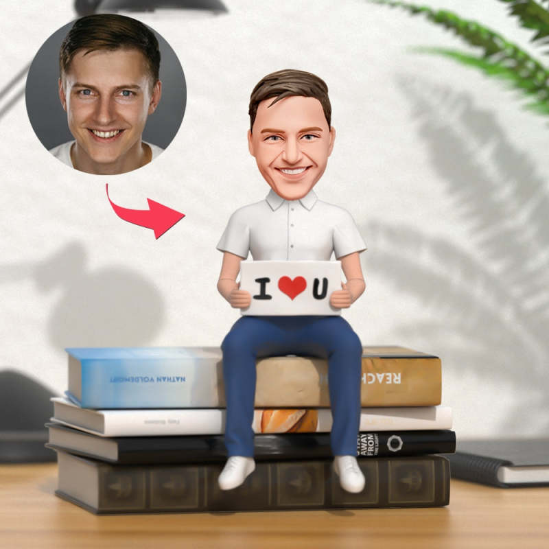 Home / Custom Bobblehead Man in White Shirt Holding I love you Sign