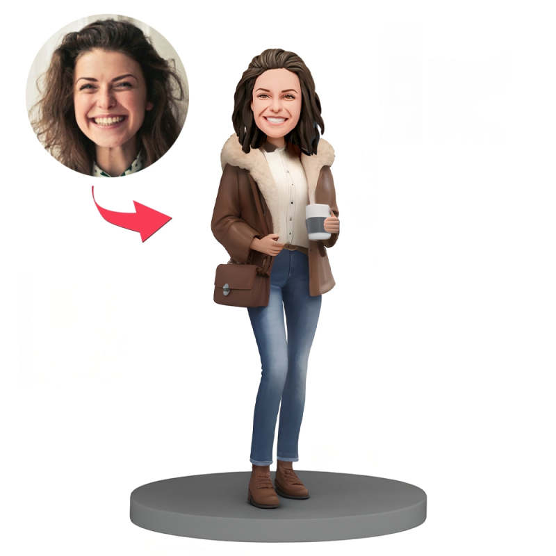 Home / Custom Bobblehead Woman in Short Cotton Coat Holding Coffee
