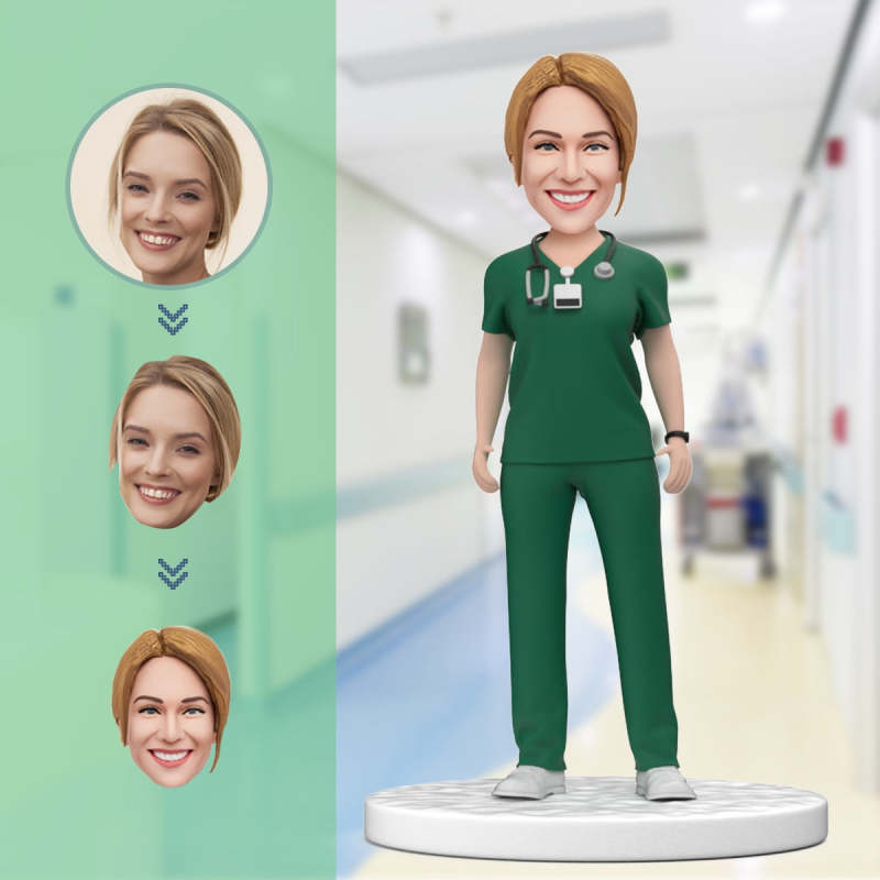 Custom Female Doctor Bobblehead in Green Scrubs with Engraved Text National Doctor's Day Gift