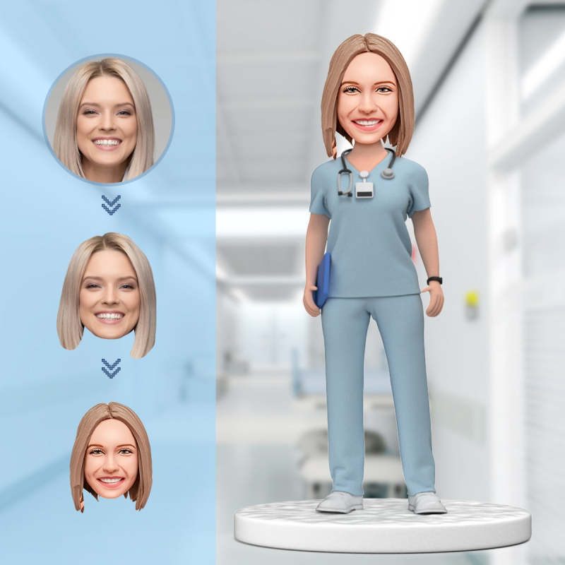 Custom Female Doctor Bobblehead in Light Blue Scrubs with Engraved Text National Doctor's Day Gift