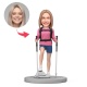 Custom Female Hiker Wearing Pink Top and Blue Shorts Holding Hiking Stick Custom Bobblehead With Engraved Text Gift