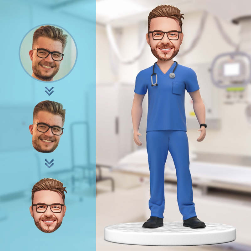 Custom Male Doctor Bobblehead in Blue Scrubs with Engraved Text National Doctor's Day Gift