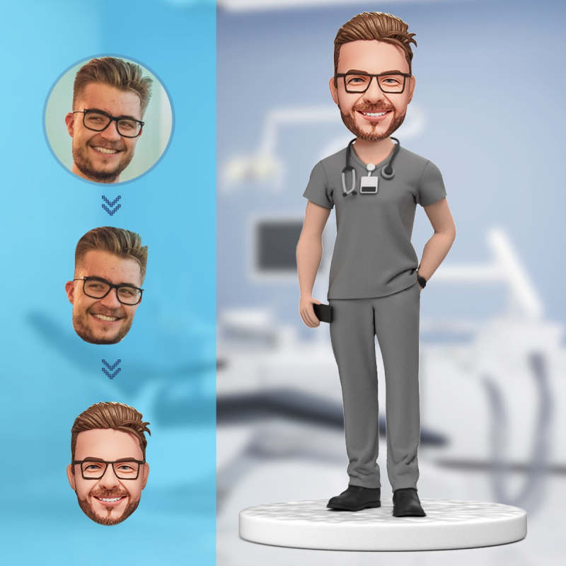 Custom Male Doctor Bobblehead in Grey Scrubs with Engraved Text National Doctor's Day Gift