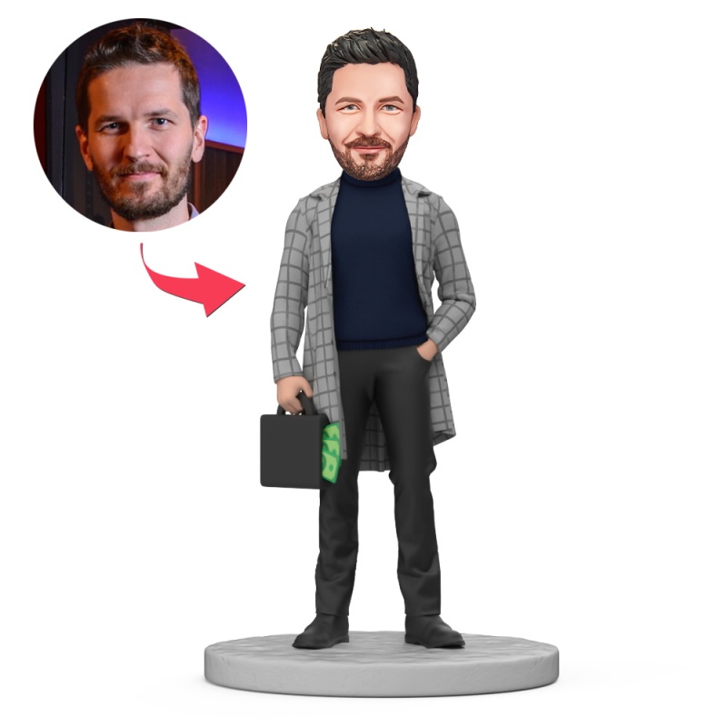 Custom Male in Gray Suit Holding Handbag Custom Bobblehead With Engraved Text Gift