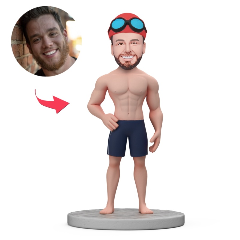 Custom Man Wearing Swimming Cap and Black Swimming Trunks Custom Bobbleheads With Engraved Text Gift