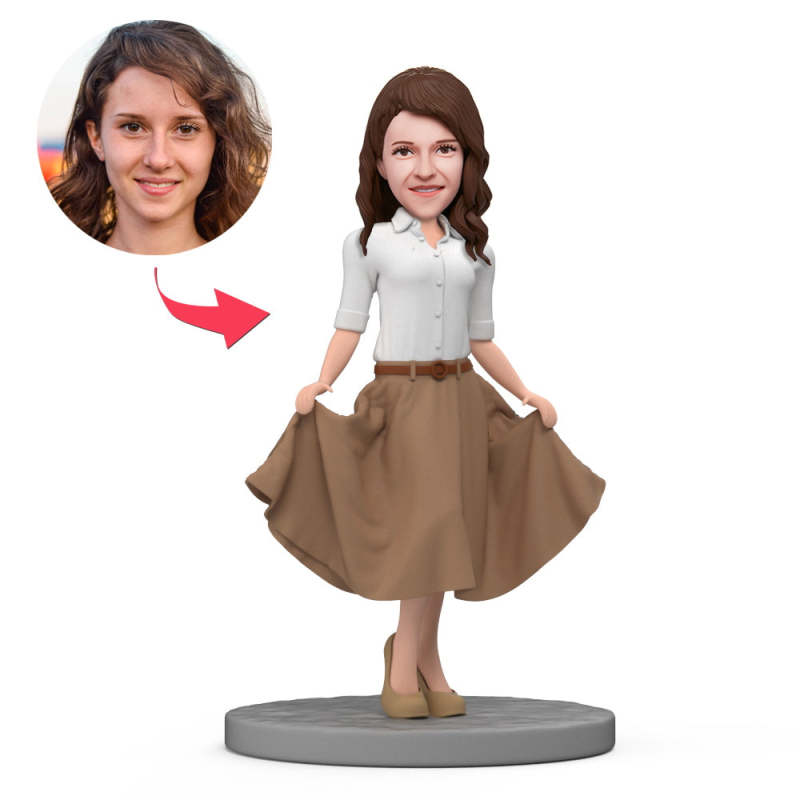 Fashionable Woman Wearing White Shirt and Brown Skirt with Engraved Text for Mom