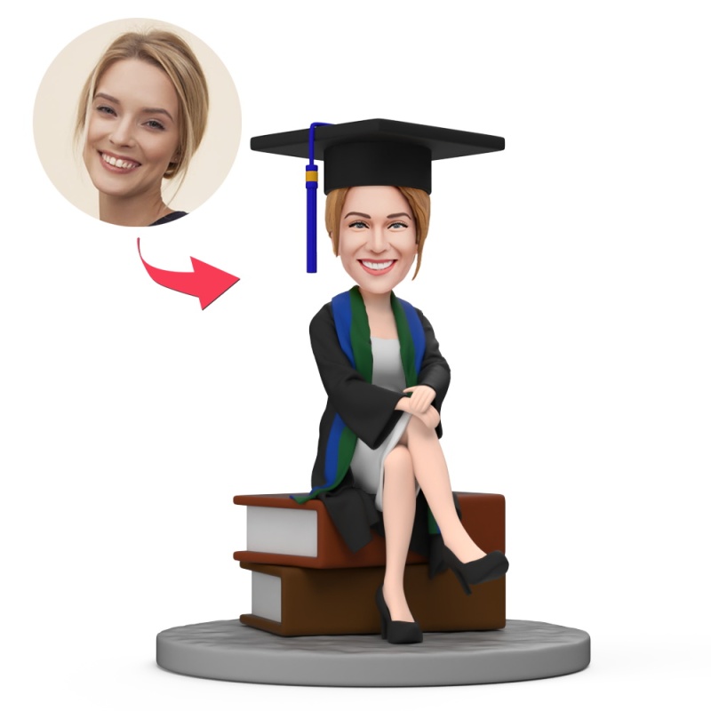Female Graduate Sitting on a Book Custom Bobblehead with Engraved Text