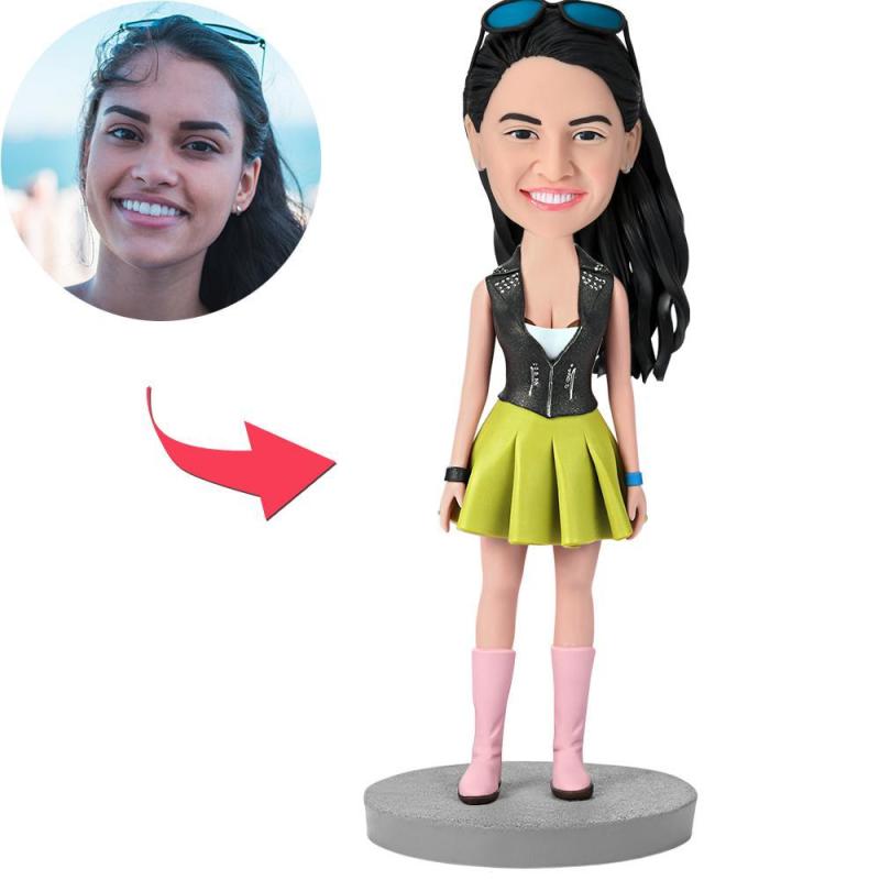 Female Wearing Green Dress Custom Bobbleheads With Engraved Text