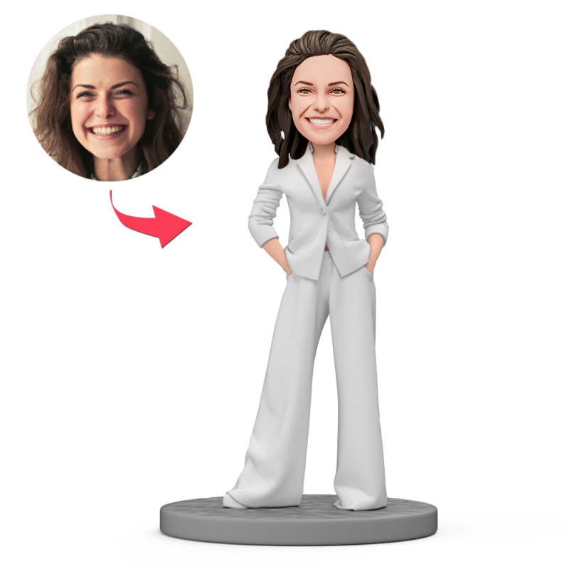 Gift For Her Custom Bobblehead Beautiful Woman Wearing Fashionable White Suit