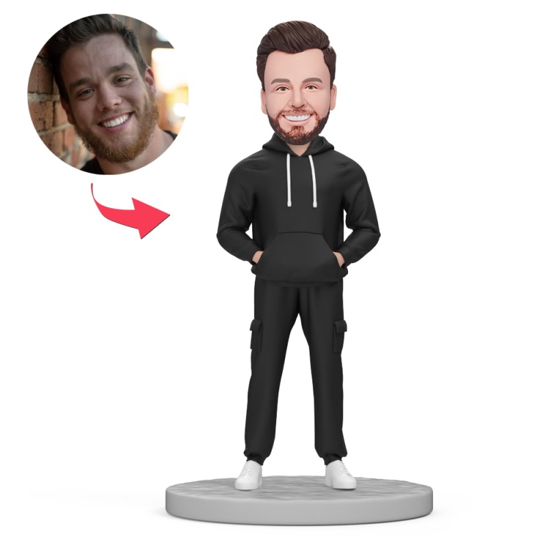 Male Boss Wear Black Tracksuit Suit Custom Bobblehead with Engraved Text