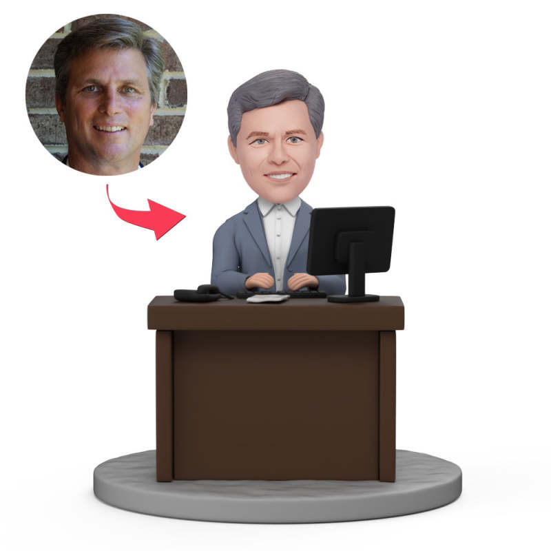 Male Boss Work at Desk Custom Bobblehead with Engraved Text