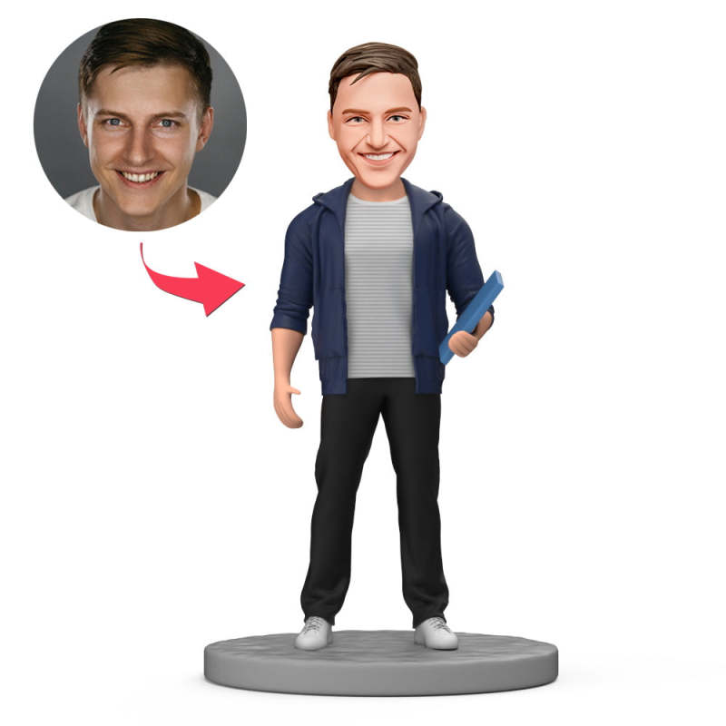 Male Student Wear Casually Hold a book in Hand Custom Bobblehead with Engraved Text