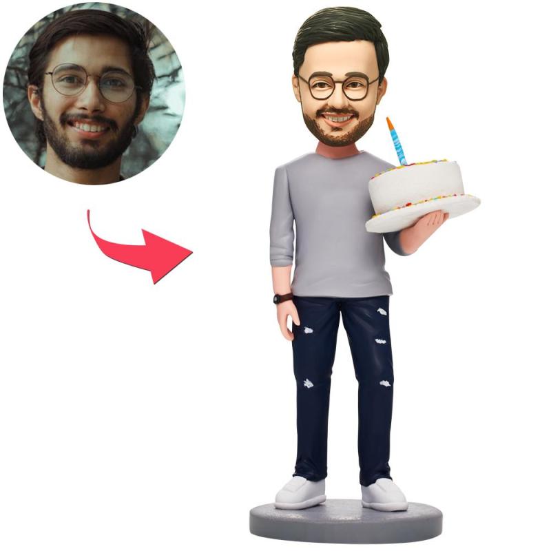 Man Holding Birthday Cake Custom Bobbleheads With Engraved Text