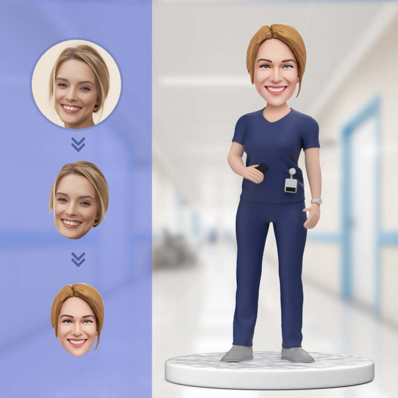 Personalized Female Doctor Bobblehead in Dark Blue Scrubs with Engraved Text National Doctor's Day Gift
