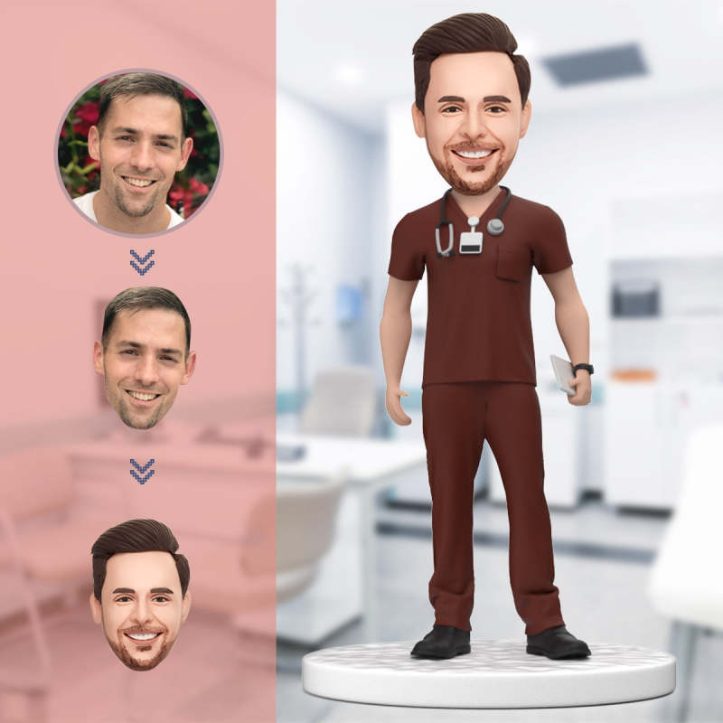 Personalized Male Doctor Bobblehead in Red Scrubs with Engraved Text National Doctor's Day Gift