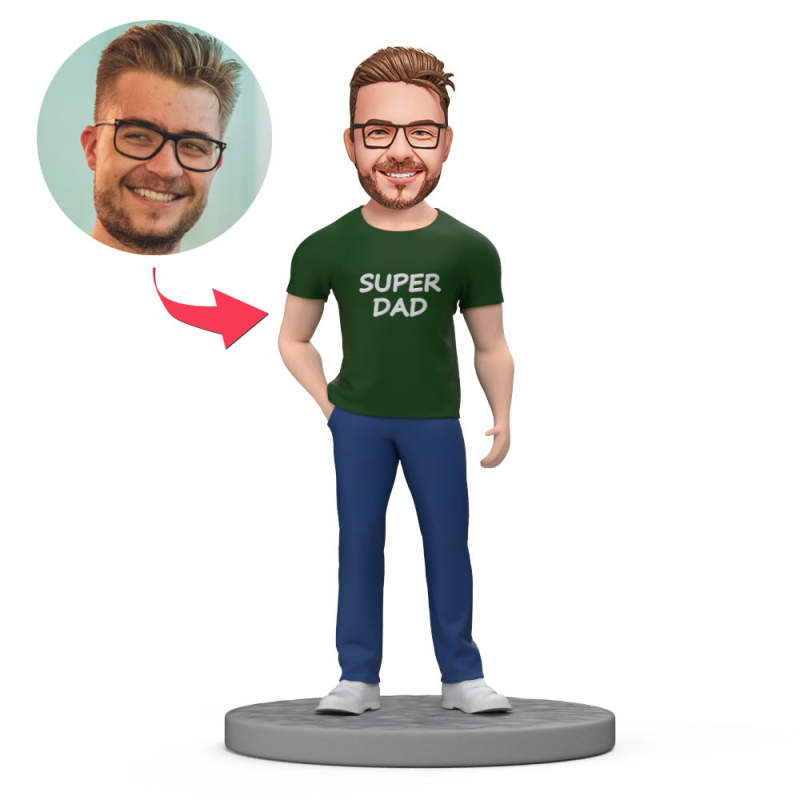 Home / Super Dad in Green Shirt Custom Bobbleheads with Engraved Text